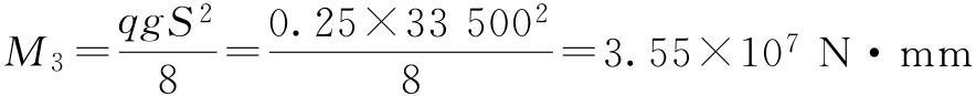 兩腹板中心線間距b1=1400mm,主梁高度h0=2750mm;運(yùn)行沖擊系數(shù)取φ4=1.24;起升沖擊系數(shù)取φ2=1.22;大車加減速a=0.1m/s2;額定起升量Q=3000000N;小車重量GXC=580000N;小車基距b=4400mm;小車跨距S=33500mm。大車半個(gè)橋架的重量Gq=565000N(主梁+走臺);